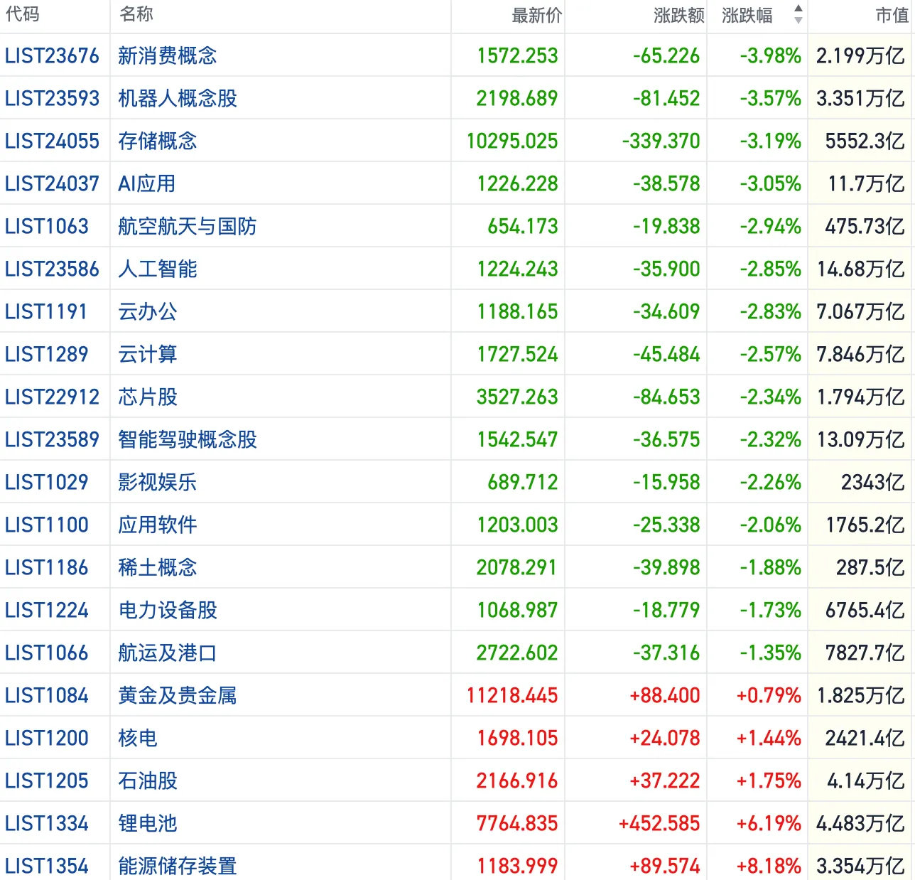 其他方向上,AI主线出现回调,软件、芯片股跟跌。此外,军工、影视、机械、海运、地产、餐饮等行业齐跌。