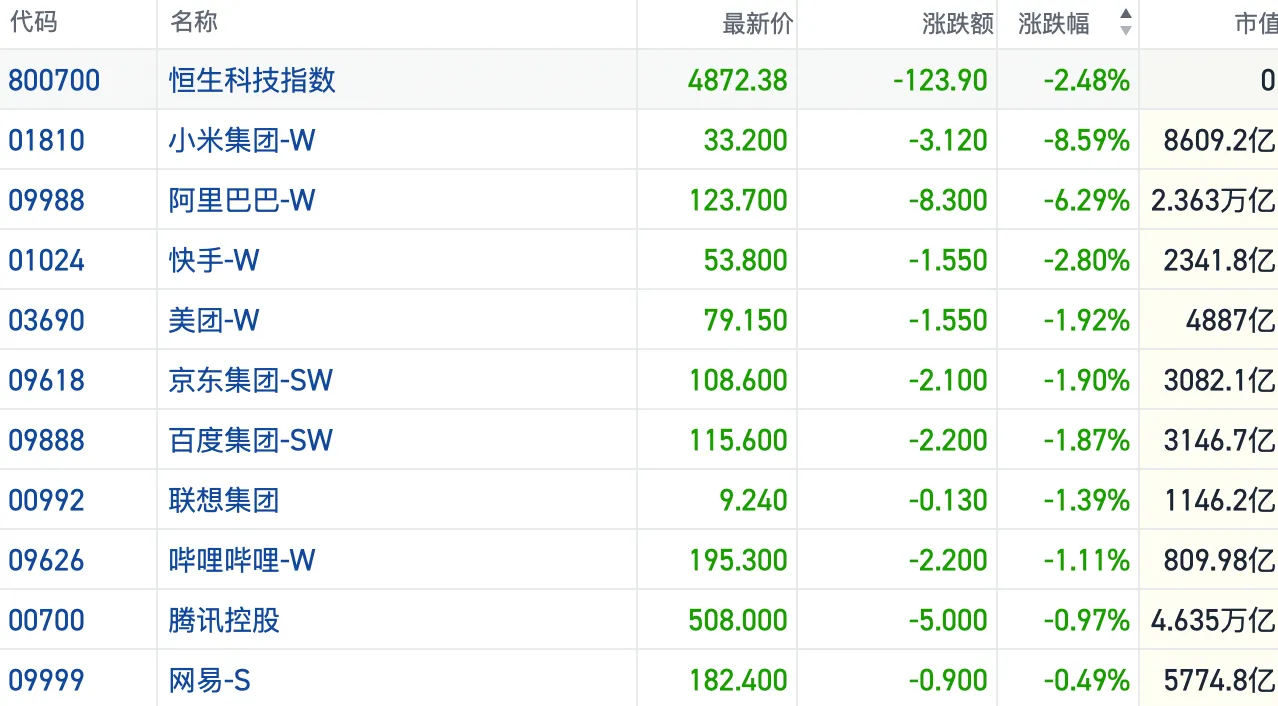 盘面上,今日大型科网股明显承压,小米大跌近9%,阿里巴巴绩后跌超6%,京东、百度、腾讯、美团均有下挫。